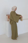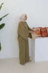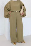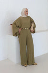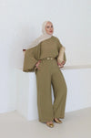 The set features a relaxed-fit top with a longer back hem for added coverage and flow, paired with coordinating wide-leg pants for a polished yet breathable look. Designed in a soothing sage hue, it’s perfect for spring and summer styling, whether you’re dressing up for an outing or keeping it casual and refined.